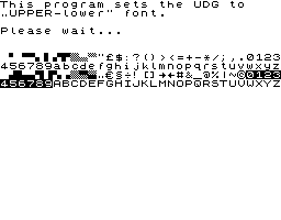 Here is an example program that uses UDGs (available in version 2.7). It includes a character set (font) with upper and lower letters. upperlowerfont.p generates the font and displays it on the screen. As you see in the picture it also sets up some extra chracters.